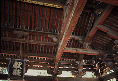 The plaque says "Xian dian," and is centred in the back wall. Above it the ang (lever arm) extends to the middle purlin.