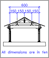 For a ting tang, a bay is 2 rafters deep (not more than 300 fen deep). However, the depth of the bays may not be demarcated by columns. Our sample building, for example, is 2 bays deep, but there are no interior columns to indicate the two bays. (See illustration.) The depth of our sample building is 4 rafters x 150 fen = 600