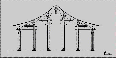 The model is 10 rafters deep, with 6 columns. It is a ting tang: the columns are different heights and extend straight up to the roof purlins.